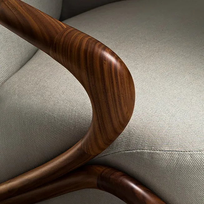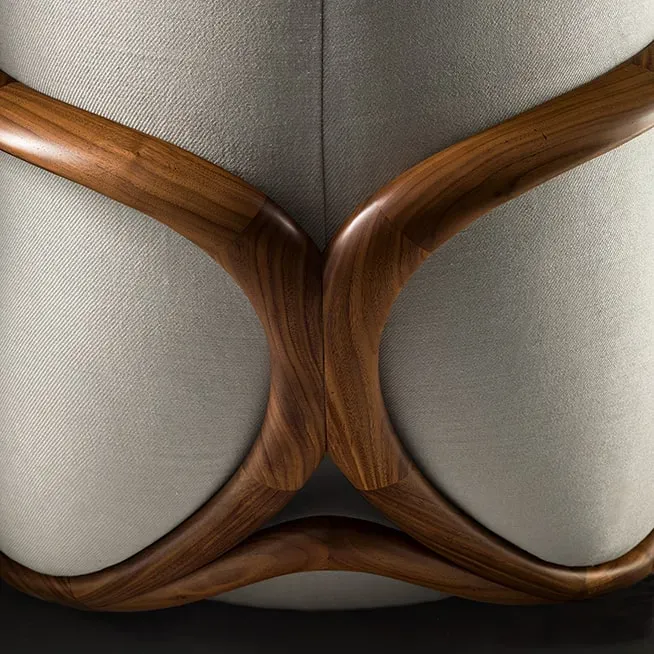 A Hug karosszék Rossella Pugliatti 2013-as tervezése, ahol a fa szerkezet és a lágyan formált kárpitozás természetes egységbe rendeződik. A forma átölelő karaktere a kényelmet és a kézműves elegancia időtlen harmóniáját idézi.