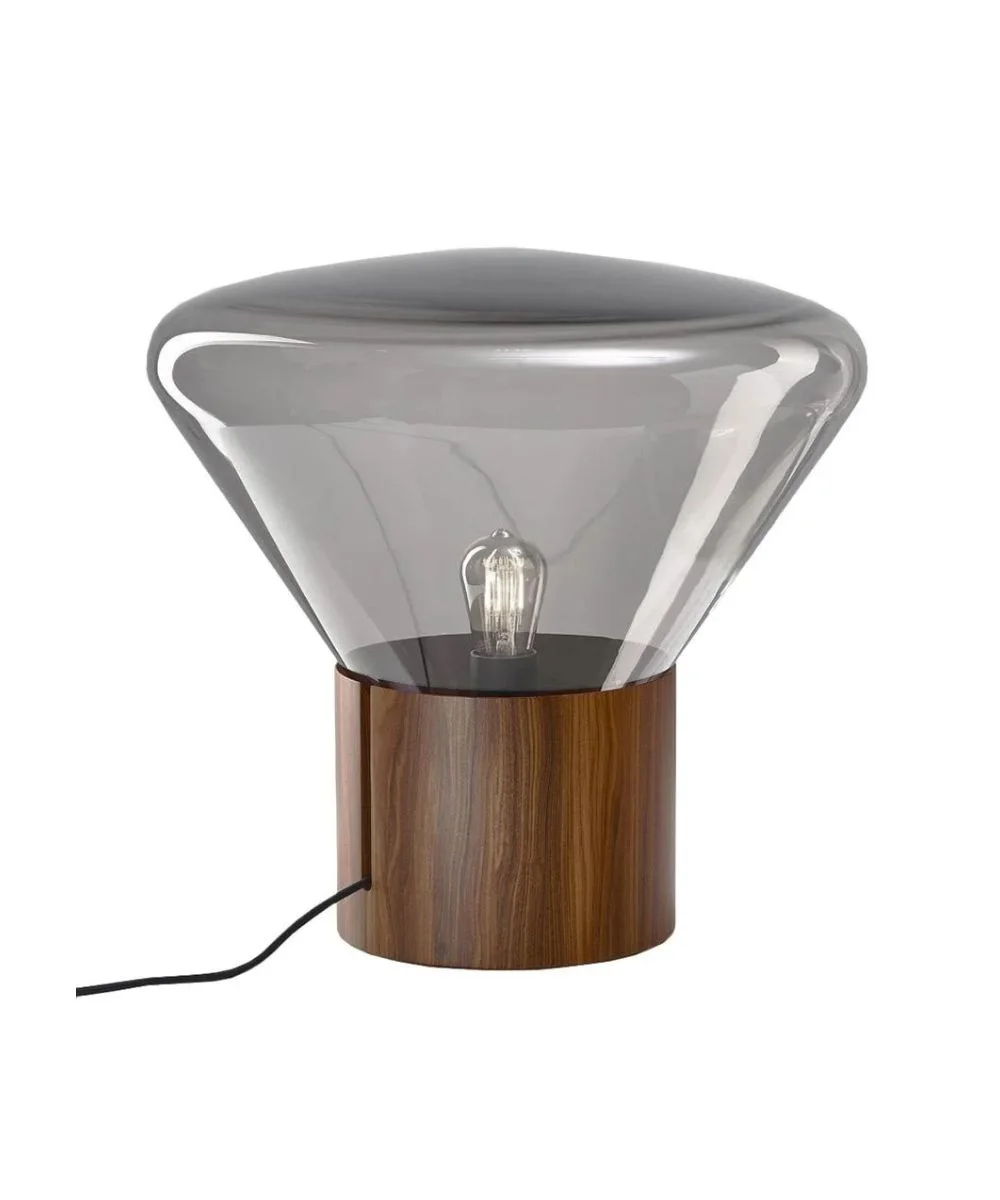 A Brokis Muffins Wood 02 Lamp a márka ikonikus kollekciójának része, amely a fény, az üveg és a fa természetes harmóniáját ünnepli. A füstszínű, kézzel fújt üveg búra és a diófa talp egyensúlya meleg, időtlen atmoszférát teremt.